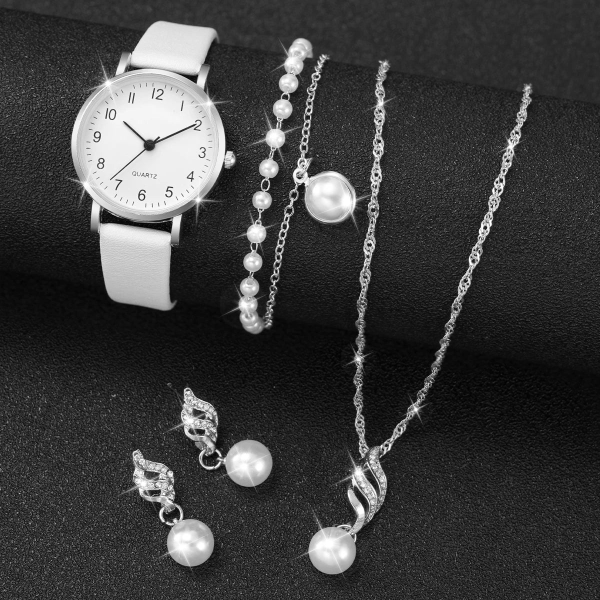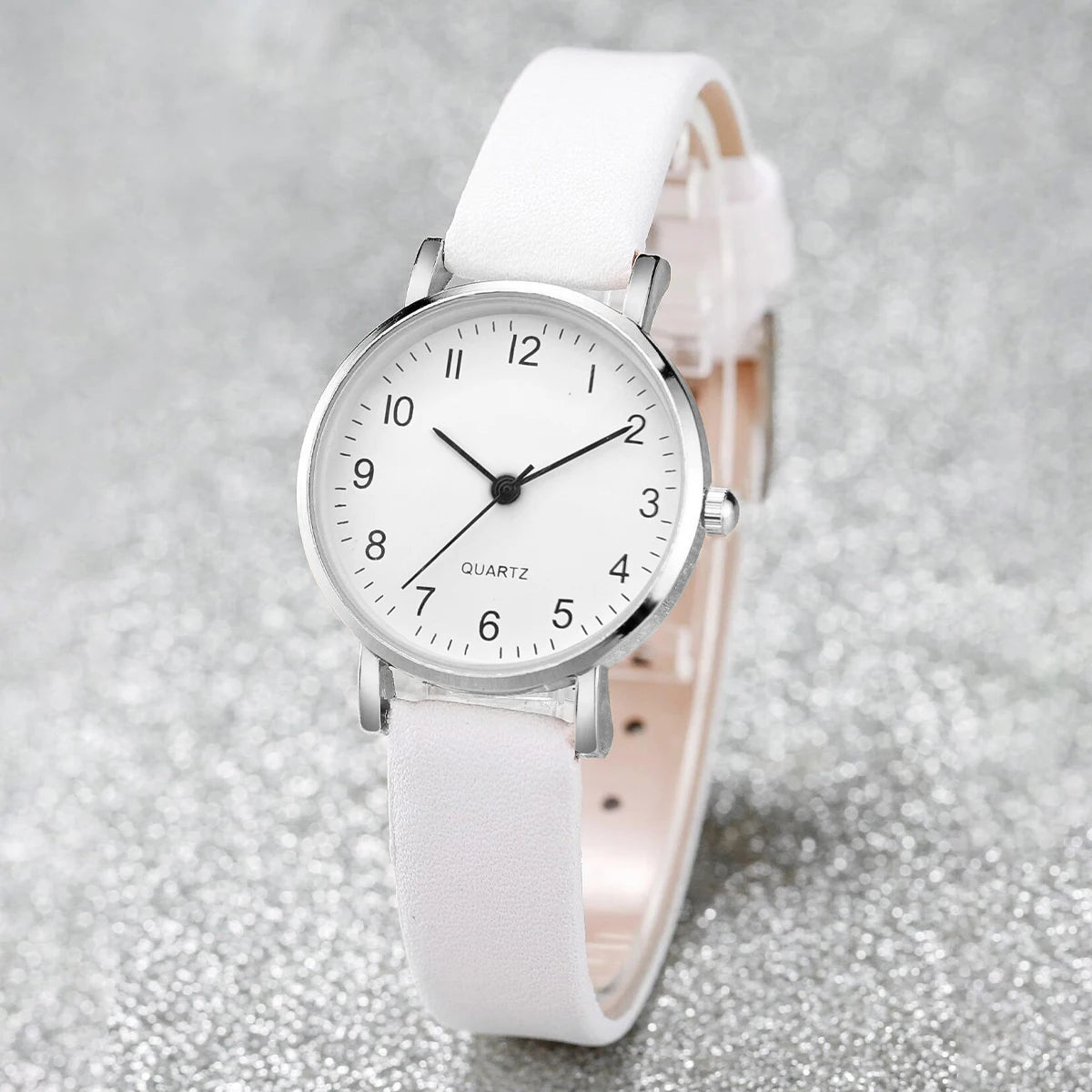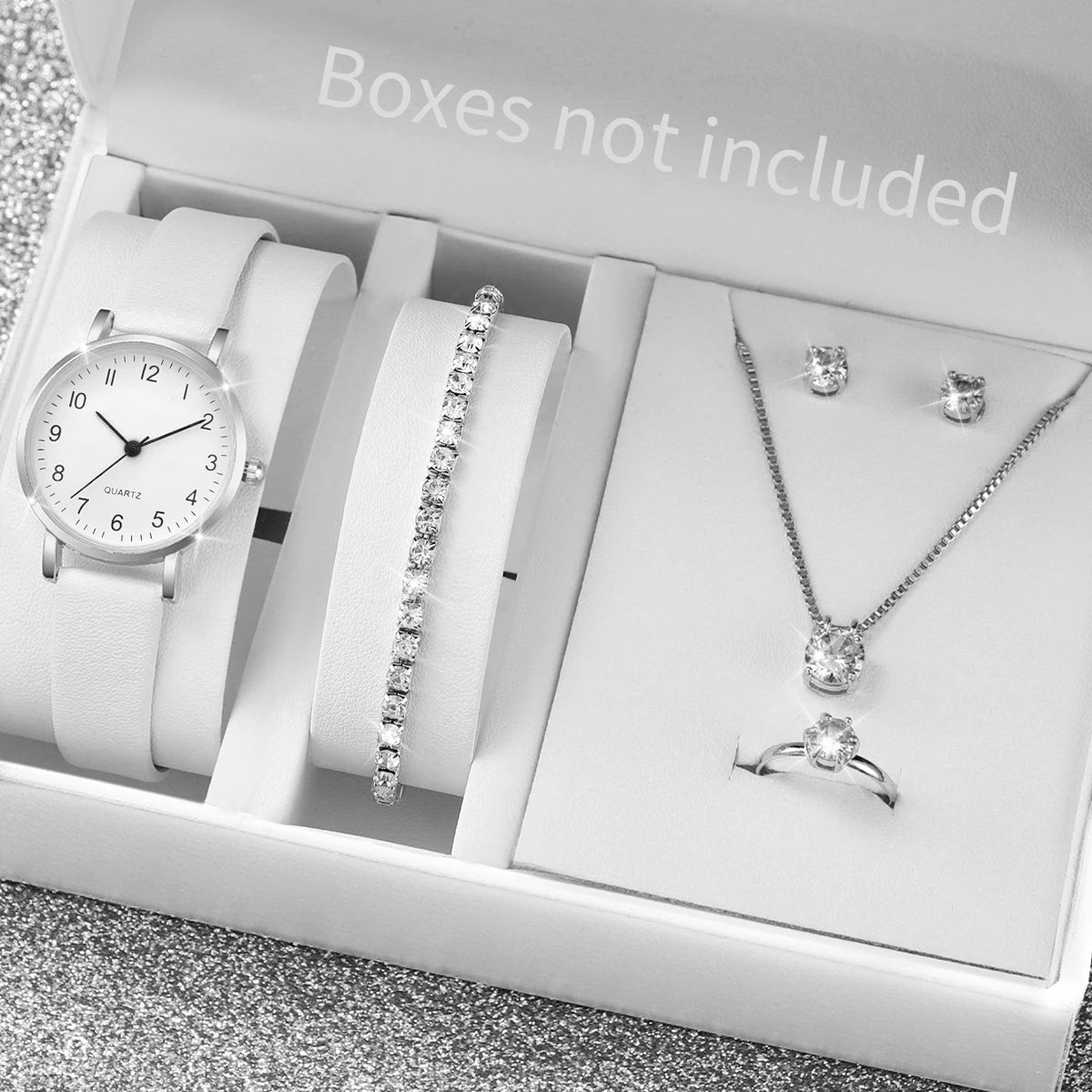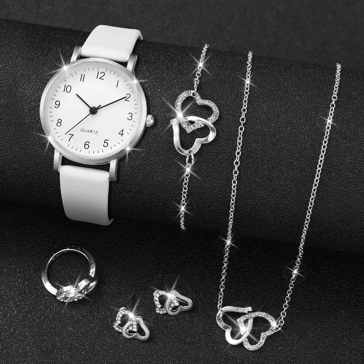 Upgrade your everyday style with this fashionable women’s quartz watch set. Each watch features a stainless steel case, leather band, Arabic numeral dial, and elegant diamond accents. Perfect for casual or party wear, this 5/6-piece set (without box) is lightweight, stylish, and versatile.